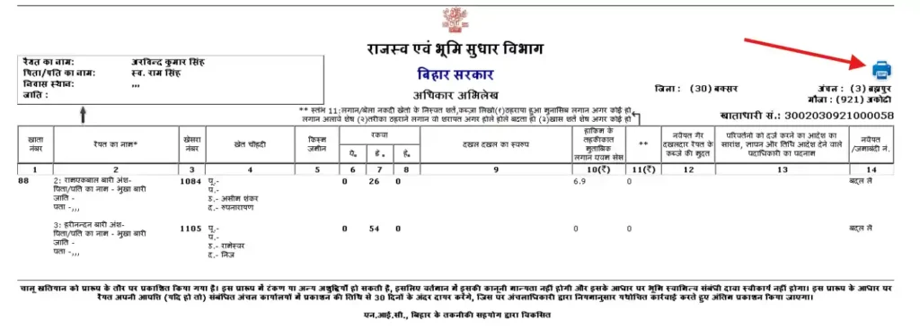 • अब आपको अधिकार अभिलेख की जानकारी pdf सामने आएगा यह नया खतियान आप प्रिंट कर सकते हैं यहां पर अपने प्लॉट नंबर, अपना नाम, Plot details इत्यादि जानकारी देख सकते हैं