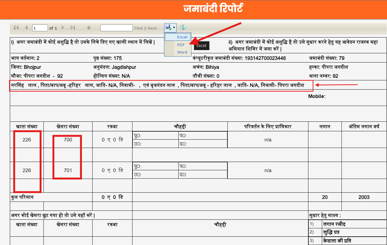 - अब नीचे आपको भूमि से जुड़ी सभी जानकारी दिखाई देंगे यहां पर आप खाता संख्या खेसरा संख्या प्लॉट का कुल रकबा एवं प्लॉट किसके नाम से हैं जमींदार का नाम एवं उसके पिता या पति का नाम देख सकते हैं