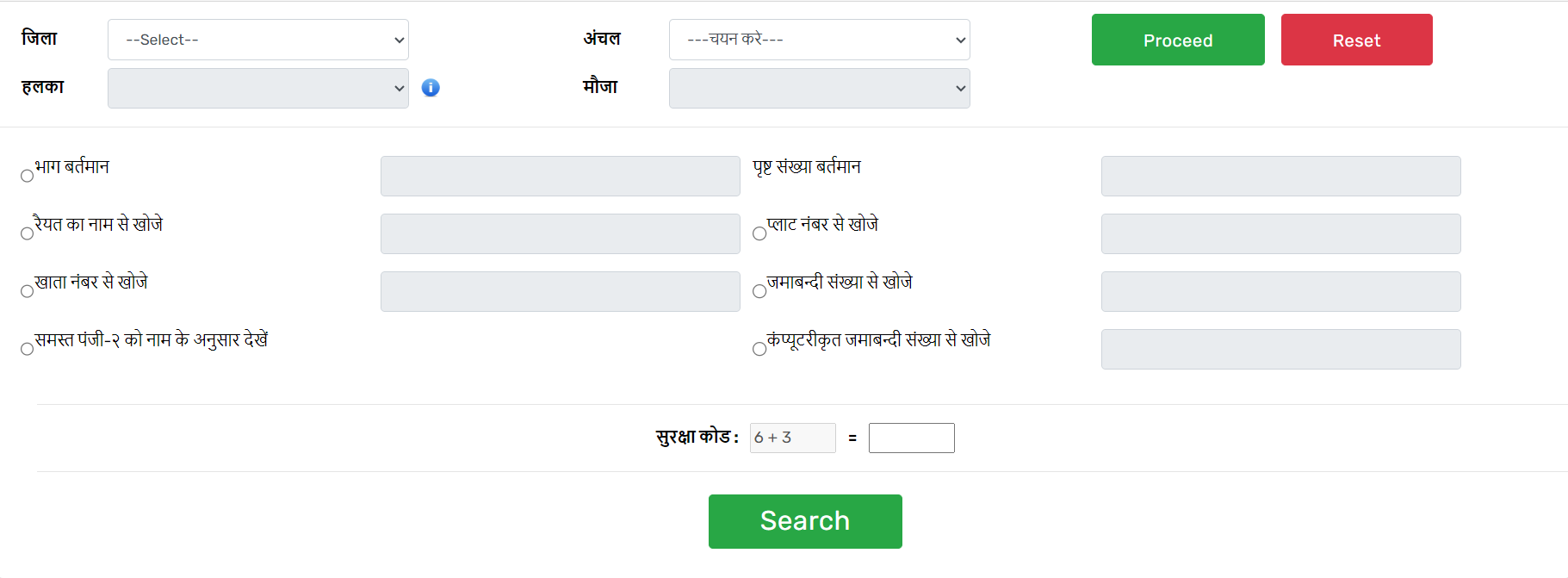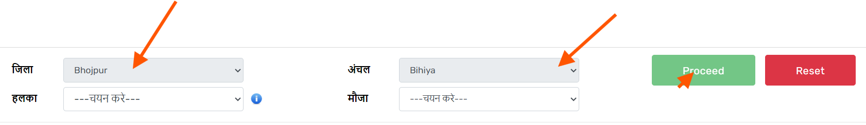 - क्लिक करते ही अगला तब खुल जाएगा यहां पर अपना जिला सेलेक्ट करें आंचल सेलेक्ट करें और प्रोसीड बटन पर क्लिक करें